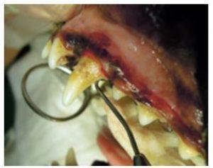 5歳 Mダックス(男の子) 1.左上顎犬歯の内側に深いポケットが認められ、歯科レントゲンでも問題が確認されました。2.外観だけでは、スケーリング後の状態は、とてもきれいに見えます。3.抜歯のために歯肉を...