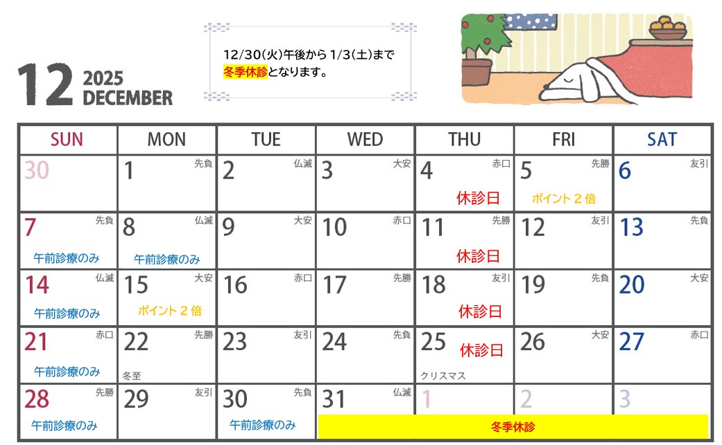 12月30日(火)午後~1月3日(土)は、冬季休診となります。