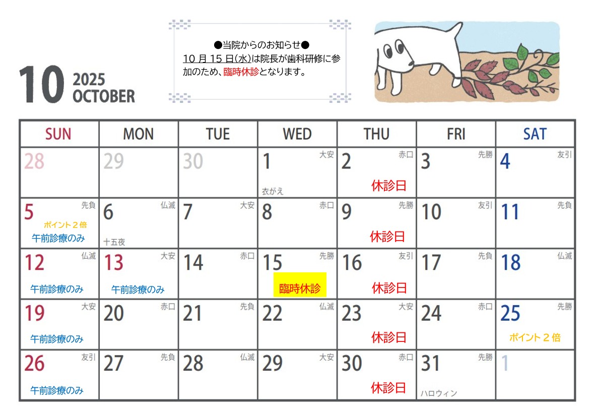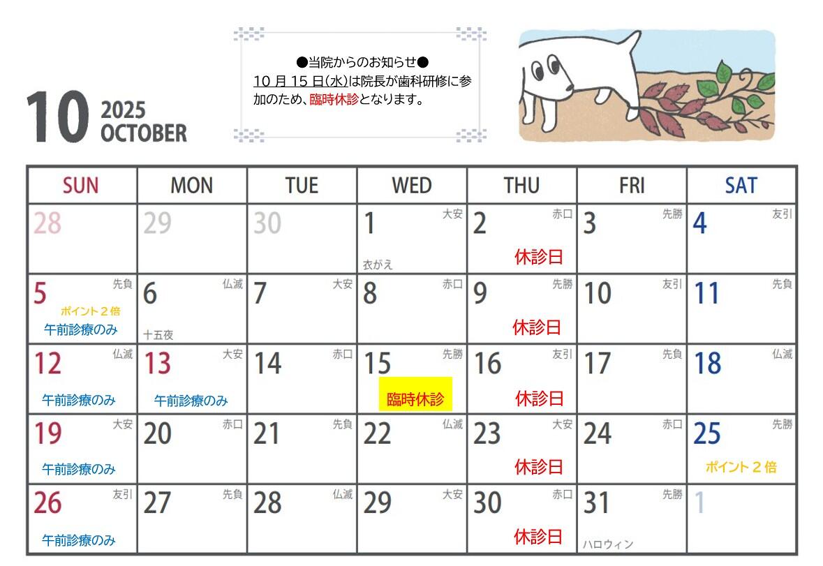 10月のカレンダーの配信と、臨時休診のお知らせになります🎃