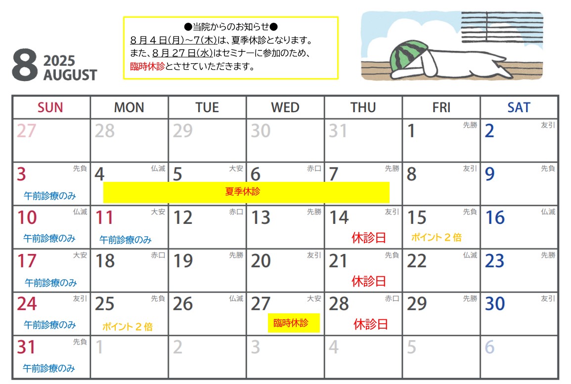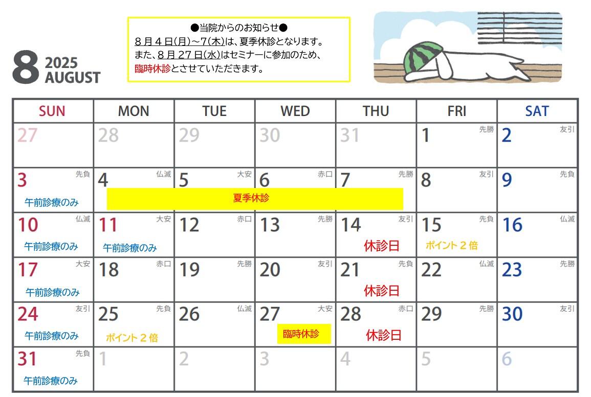 8月のカレンダーの配信と、臨時休診のお知らせになります🏄
